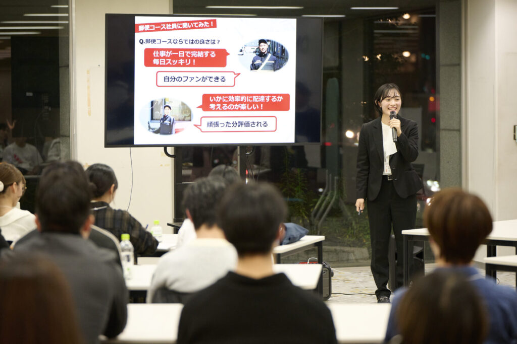 この二つが組み合わさることで、最初はネガティブなイメージだった郵便コースが、「現場でしか得られない深い人間理解を武器に、将来の経営を支えるリーダーを目指す道」だと感じるようになりました。これを上手くプレゼンすることで、興味を持ってもらえる学生を1人でも増やしたいなと思いました。