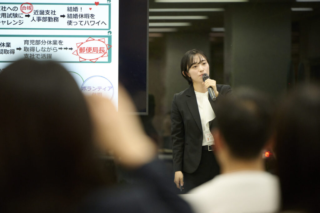 人事担当の方から「実際に日本郵便で働いている方のキャリアをモデルケースにして紹介しよう」とアイデアが出て、さらに伝わりやすいピッチになっていきました!